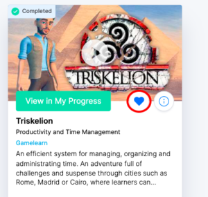 - Para añadir el curso a “Favoritos”, haz clic en el corazón azul situado en la parte derecha de la pantalla donde, también, encontrarás los detalles del juego.