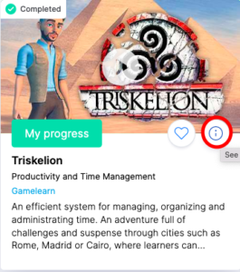 - Accede a los detalles del curso haciendo clic en el símbolo con la “i” que corresponde a la información del juego.