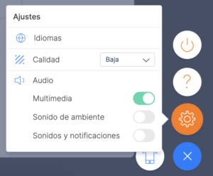 Sonido y notificaciones: audio de la interfaz, botones, notificaciones de feedbacks y puntuaciones.