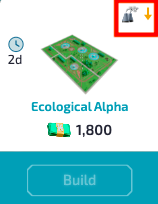 You’ll find the buildings of each category in the “Build” menu. Each of these is represented on a card. At the top right, you’ll see the contamination symbol and a colored arrow. The color of the arrow represents at what level future contamination will be after the building is constructed. The position of the arrow represents the increase or decrease of contamination: the up arrow means that future contamination will go up; the down arrow means that future contamination will go down.