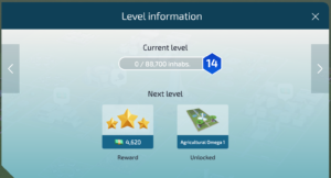 To see the rewards of the next levels, access the ‘Level information’ window by interacting with the city level in the main game screen.