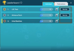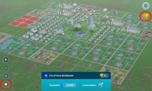 From this screen you can see the city of the other selected player. To exit, you can either go directly to your city or go back to the leaderboard by clicking on the house at the bottom left or the cup at the top right.