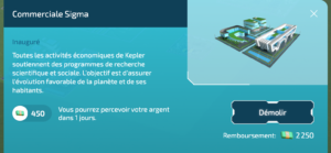 Vos bâtiments commerciaux produisent des Keplers chaque jour. Vous obtiendrez de nouveaux Keplers après avoir perçu les Keplers obtenus précédemment. Autrement dit, les Keplers obtenus ne s’accumulent pas. Par exemple, si vous revenez au bout de 4 jours sans percevoir votre argent, vous aurez uniquement accès au dernier lot de Keplers, car le lot précédent aura disparu.