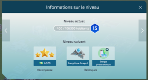 Chaque niveau comprend un objectif de population. Pour savoir à combien doit s’élever votre population pour passer au niveau suivant, interagissez avec le niveau de la ville (en haut à gauche de l’interface) afin d’ouvrir la fenêtre « Informations sur le niveau ».